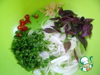 Снять листочки с веточек базилика и нарезать полукольцами репчатый лук. |