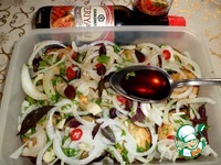 Приготовить соус-маринад. Развести в воде соль и сахар, добавить уксус (у меня яблочный), соевый соус ТМ Киккоман Террияки, перемешать. Пробуйте и все регулируйте по своему вкусу. |