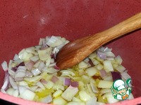 Следующий момент- масло оливковое (!) ароматное холодного отжима. Рафинированные масла не использовать. Масло разогреть в кастрюле и выложить лук, а чуть позже и чеснок, довести до золотистого цвета. |
