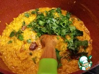 Вместе с рисом и маслом добавляем и золотую специю Греции-шафран. Варим на среднем огне с полуприкрытой крышкой. Регулируем соль-перец. |