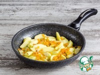 Яблоки очистите от кожицы, удалите сердцевину и нарежьте небольшими дольками. Потушите их с оставшимся сахаром и 10 г масла до мягкости, 5–7 мин. Добавьте горсть изюма, перемешайте. |