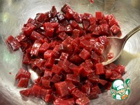 Отваренную и охлаждённую свёклу нарезаем кубиком и хорошенко обмазываем её растительным маслом. Это нам нужно для того, чтобы свёкла не так обильно делилась своим соком с другими ингредиентами. |