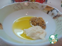 В чашке соединить зернистую горчицу, сливочный хрен и масло оливковое. Хорошо размешать до однородного состояния. |