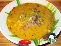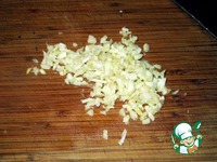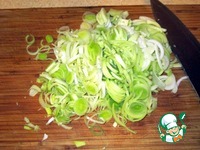 Добавляем в кипящий бульон нарезанный лук порей, мясо, чеснок и пюре из обжаренных овощей. Варим 5 минут на медленном огне под крышкой. |