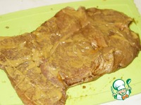 Замаринованное мясо разложить на доску, смазать тонким слоем горчицы. |
