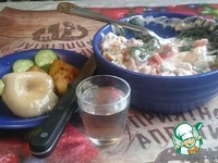 Картошку режем небольшими кубиками, добавляем в салат, солим, перчим по вкусу, добавляем майонез и укроп. Перемешиваем. Часика два нужно дать салатику настояться. Вот и все. |
