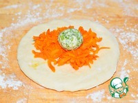 Каждую часть теста раскатать в лепешку. В центр выложить морковь, сверху - шарик укропного масла. |