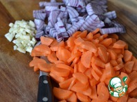Морковь нарезать полукольцами. Можно мельче. Но мы любим, чтобы морковь была выразительная. Лук нарежем на кусочки. Чеснок мелко нарежем. |