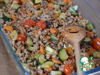 Форму для запекания смазать подсолнечным маслом. Выкладываем овощи с мясом. |