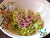 Красный сладкий лук нарезать на маленькие кубики и добавить к салату. |