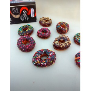 Тесто раскатываем в пласт толщиной 0.5 см. При помощи бокала выдавливаем пончики и маленькой крышкой вынимаем серединку. |