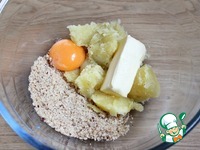 В глубокую миску кладу отваренный заранее картофель, размягченное сливочное масло, желток и 50 гр измельченного фундука. |