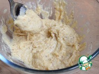 Разминаю все это толкушкой до однородной массы. Добавляю крахмал и еще раз разминаю. |
