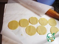 Раскатать тесто между двумя листами для выпечки до толщины 2-3 мм. Вырезать кружочки равные диаметру пирожных, около 5 см. Положить в морозилку вместе с листами. |