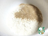 В емкость просеиваем муку, для начала не всю, примерно 250 г, отруби, соль. |