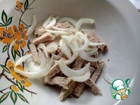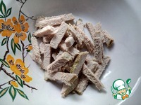 Лучше всего для этого салата использовать говядину, но за не имением оной можно взять и свинину. Мясо нарезать брусочками. |
