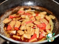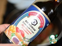 Крабовое мясо порезать произвольно, выложить в сковороду и залить соевым соусом; |