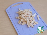 Куриное филе (150 гр.) отварить, нарезать брусочками. |