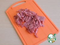 Колбасу (можно использовать ветчину) (100 гр.) нарезать тонкими брусочками. |