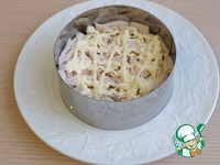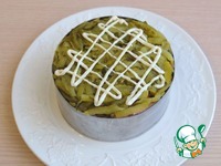 Готовый, собранный салат в кольце посыпать натертым сыром, сделать майонезную сеточку и можно подавать на стол. Приятного аппетита! |