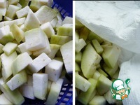 Баклажан очистить от кожуры, нарезать на кусочки, не очень мелко, хорошо посолить, залить холодной водой, накрыть тарелкой, чтобы погрузились в воду. Оставить на 10мин. |