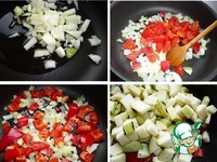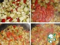 Лук обжарить в оливковом масла на среднем огне. Добавить перец болгарский, чеснок и черец чили. Обжарить коротко, добавить баклажан. |