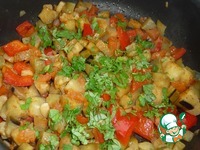 Увеличить огонь до максимума и обжаривать овощи до мягкого состояния баклажана. Добавить помидрор, щепотку сахара, кориандр, красный перец. Проверить на соль. Протушить овощи на среднем огне 2-3мин. |