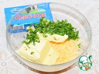 Мягкое сливочное масло (я использую сливочное масло ТМ "Экомилк" 82,5%) смешать с измельченным чесноком, рубленой петрушкой и тертым сыром. |