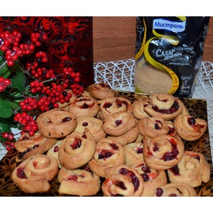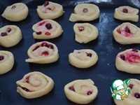 Разделить тесто на 4 части. Раскатать тонко каждую часть в прямоугольник. Посыпать тростниковым сахаром и насыпать по всему периметру ягоды. |