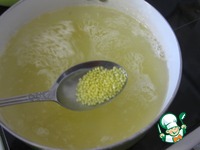Бульон вскипятить, всыпать промытое пшено, варить минут 10 на среднем огне |