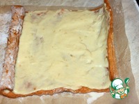 Аккуратно развернуть рулет, смазать готовым заварным яблочным кремом, свернуть в рулет, посыпать 2 ст. л. сахарной пудры. |