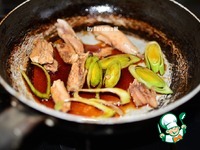 Лук-порей и куриную грудку нарезать и выложить в сковороду, смазанную маслом, добавить соевый соус; |