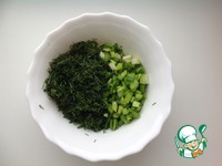 Пока тесто поднимается, приготовить начинку. Зелень помыть и мелко нашинковать. У меня зелёный лук и укроп. В оригинальном рецепте предлагались петрушка и базилик. |