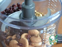 Пока пирог печется, приготовим посыпку. В кухонный комбайн выкладываем орехи, печенье и бруснику. Взбить в режиме "пульс" несколько раз, чтобы получить крупные кусочки. |