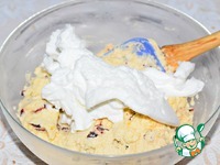 В три - четыре приема вмешать белки в тесто. Каждый раз перемешивать лопаткой движениями снизу вверх. Аккуратно, но тщательно. |