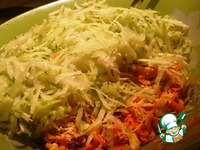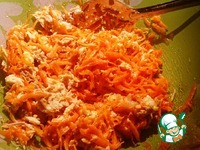 Отварную курицу охладить и расщепить на тонкие ниточки. В салатнике смешиваем курицу, морковь и лук, размешиваю и даю немного настояться, чтобы курица слегка впитала в себя ароматы жаренных овощей. |