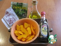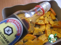 На дно формы налить масло, выложить тыкву, посыпать специями, добавить соевый соус Тщательно перемешать все руками и поставить в разогретую до 200С духовку минут на 15-20. |