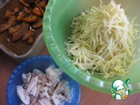 Бульон поставить на плиту, довести до кипения. Отварное мясо грудки порезать кубиком, картошку почистить и натереть на терке длинной соломкой. Готовую тыкву достать из духовки |