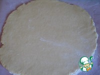 Тесто достаём их холодильника, раскатываем его в круг на пергаменте. |