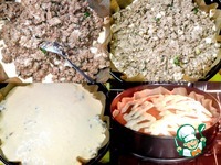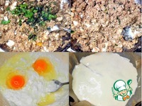 В полученный фарш разбила яйцо, добавила зелень и хорошо перемешала. В миску просеяла муку, добавила разрыхлитель, соль, сахар, налила пахту, разбила яйца и перемешала тесто. |