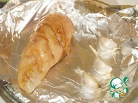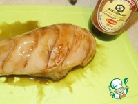 На курином филе сделать надрезы, но не до конца, натереть чесноком, растительным маслом и соевым соусом. |