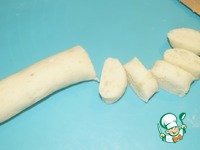Сформировать из картофельного теста колбаску диаметром 2-3 см и нарезать тонкими кружочками. |