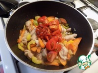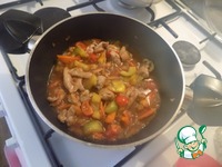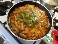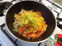 Далее-морковь и болгарский перец. Обжариваем, всё перемешивая периодически. Я больше томлю. Вы можете обжарить так, как вам больше нравится. |