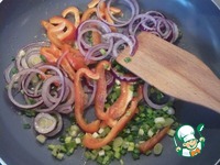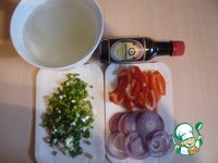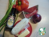 Зеленый лук чистим и шинкуем. Красный лук режем кольцами. Сладкий перец полосками. Фунчозу замачиваем в прохладной воде ( 30 градусов) на 30 мин. |