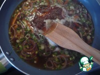 В сковороду с овощами добавляем 1/3 бульона. И тушим еще 7 мин. |