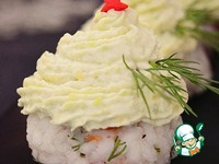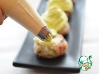 На готовые рисовые шарики при помощи кондитерского мешка с насадкой "звёздочка" отсадите крем из авокадо спиральными движениями |