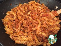 В последнюю очередь кладём предварительно отваренные макароны и перемешиваем. |
