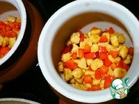 Выкладываем индейку с перцем в горшочки поверх лука. |