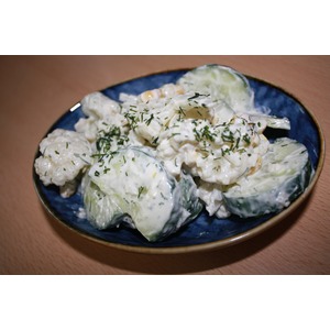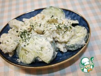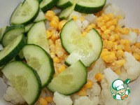 Смешать капусту, огурец и кукурузу. Добавить заправку. Все хорошо перемешать и дать настояться около 15 минут. |