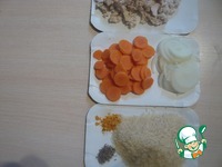 Отваренную курицу мелко режим, морковь нарезаем кружочками, лук колечками. Рис смешиваем с зирой и шафраном. |